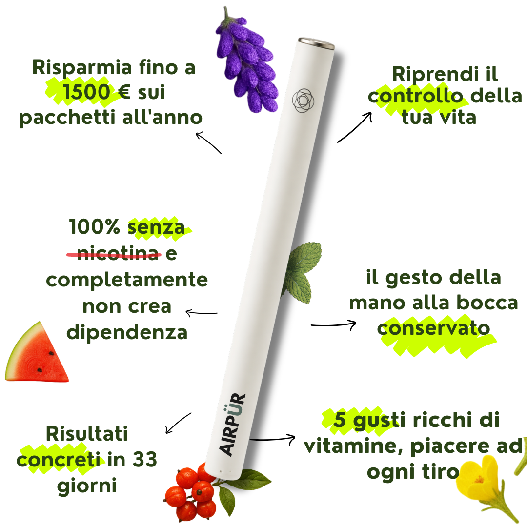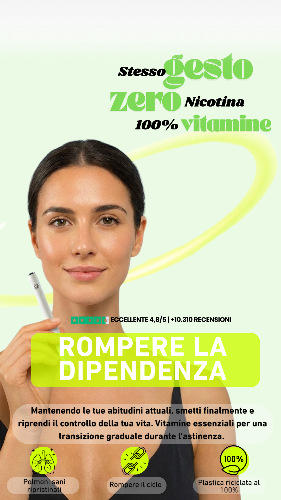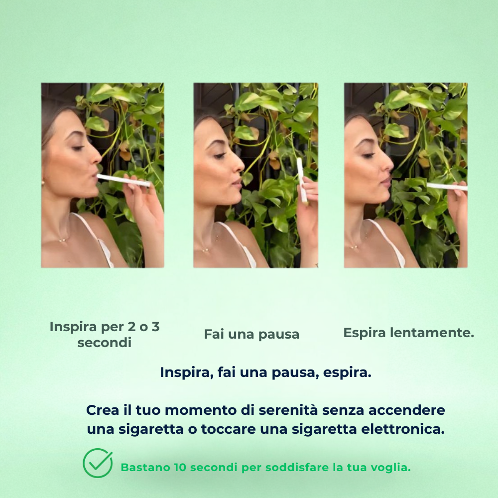 Riproduce l’inspirazione, l’espirazione e il movimento mano-bocca a cui il tuo cervello è abituato — mentre diffonde una miscela rilassante di vitamine B che favoriscono il recupero della dopamina e riducono il desiderio.